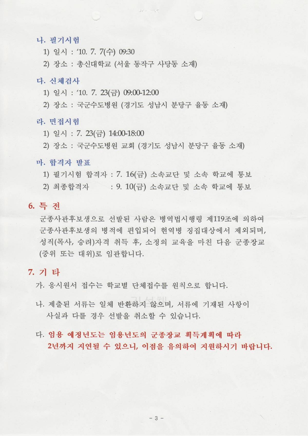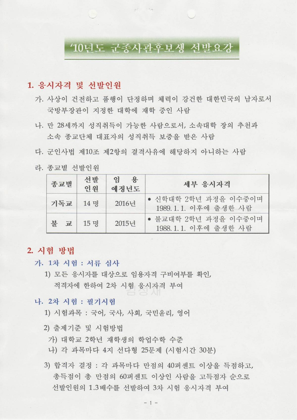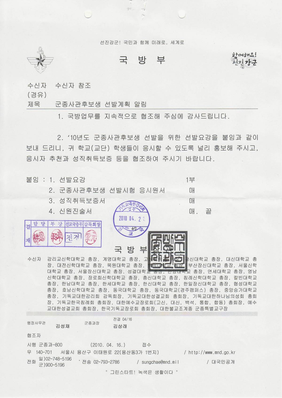 2010년도 군종사관후보생 선발계획이 발표되었습니다. 자세한 내용은 파일로 확인하시기 바랍니다. 공문이 4장인 관계로 선발계획 1, 2로 나누어 올립니다. 필요한 서류는 해당 학교에서 받으시면 됩니다. 선교국으로제출하는 서류에는 선교자료실(국내선교부)에 있는 군종사관후보생 선교국 제출서류를 다운받아서 사용하시기 바랍니다.