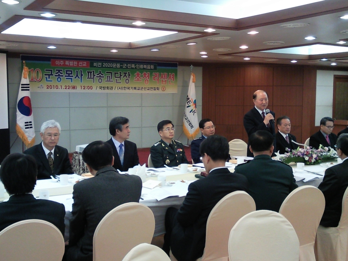 지난 1월 22일(금) 12:00. 국방부 국방회관에서 군선교연합회 주관으로 2010년 군목파송교단장 모임이 있었다. 이 행사는 군선교연합회 곽선희 이사장의 초청형식으로 매년 1월에 열리고 있으며 각 교단장과 총무, 군선교회 대표, 군목단장 등이 참석 대상이다.