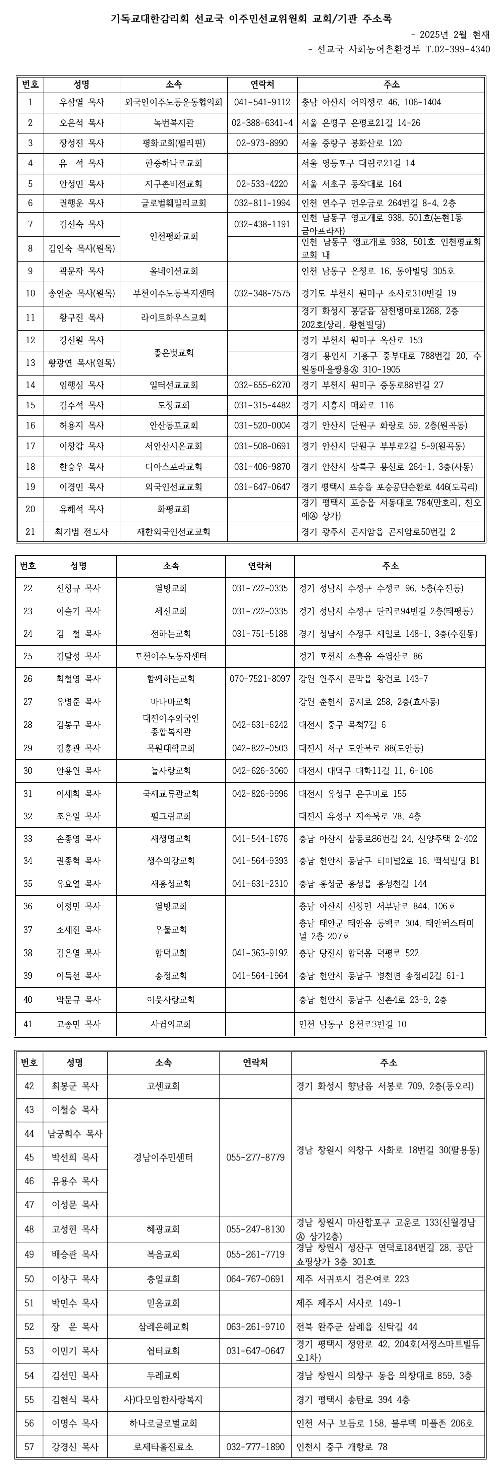 이주민들이 다양한 사정으로 거주지를 옮길 경우 신앙생활을 계속할 수 있도록 아래와 같이 이주민선교위원회에 속한 교회와 기관의 전화번호와 주소를 안내해 드리오니 사역에 참조하시기 바랍니다.