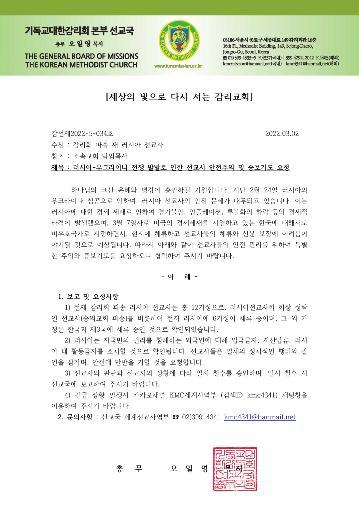 러시아-우크라이나 전쟁 발발로 인한 선교사 안전주의 및 중보기도 요청