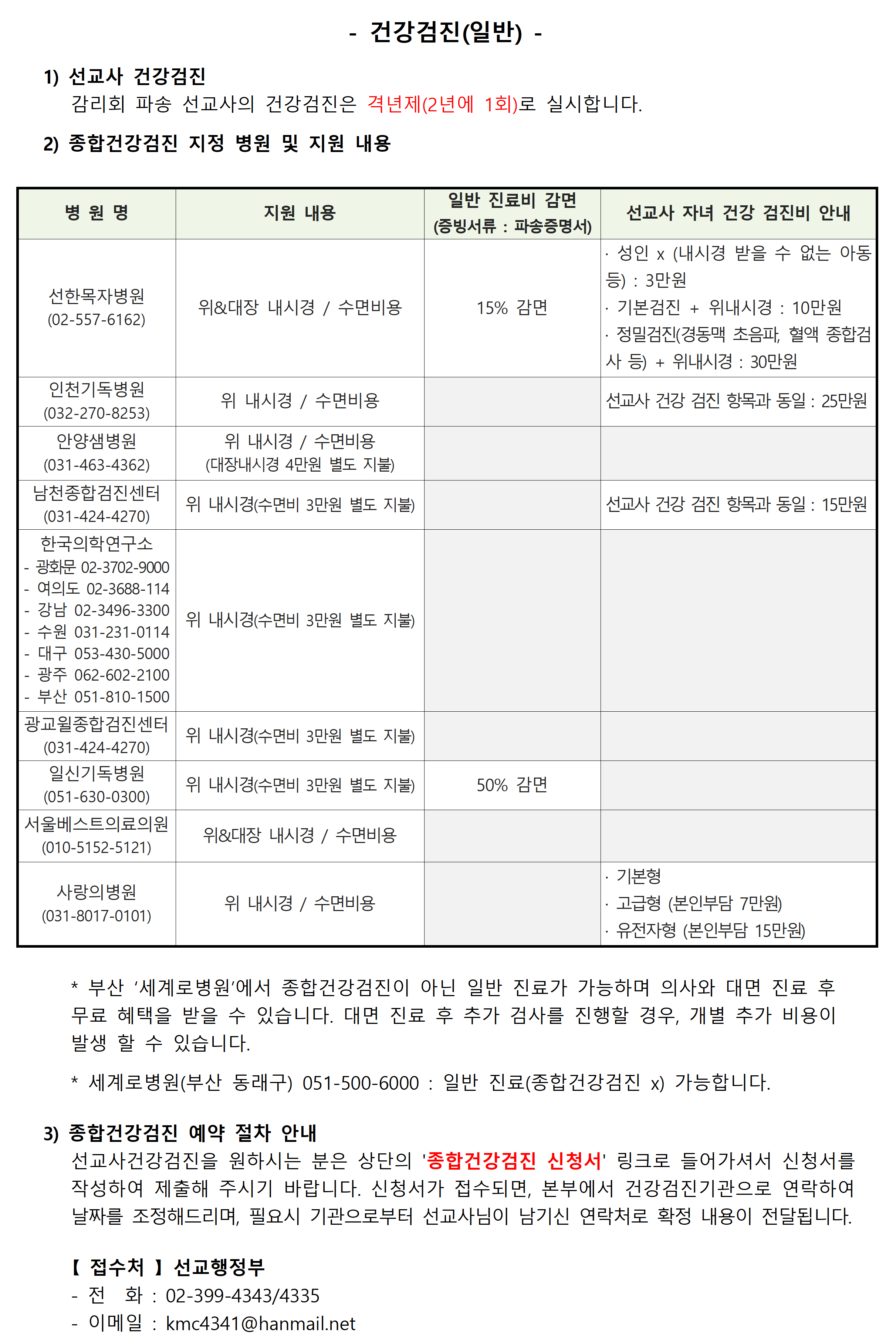 [종합검강검진 신청서 링크] 신청서 작성 링크 2년에 한번 받으실 수 있는 선교사 건강검진 신청을 위 링크로 접속하셔서 신청하여 주시기 바랍니다. 반드시 한국 연락처(핸드폰), 이메일, 카톡 아이디를 기록하여 주시기 바랍니다.