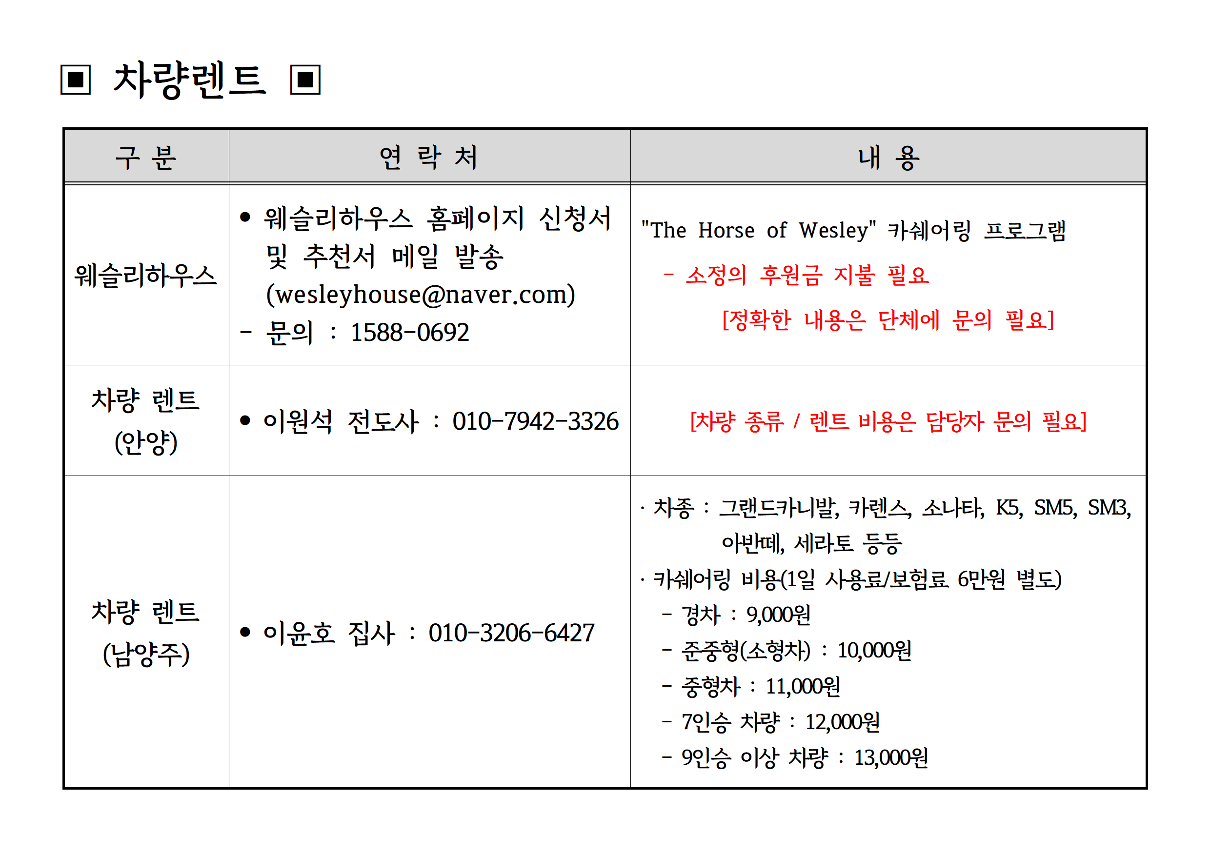 [선교행정] 선교사 차량렌트 안내
