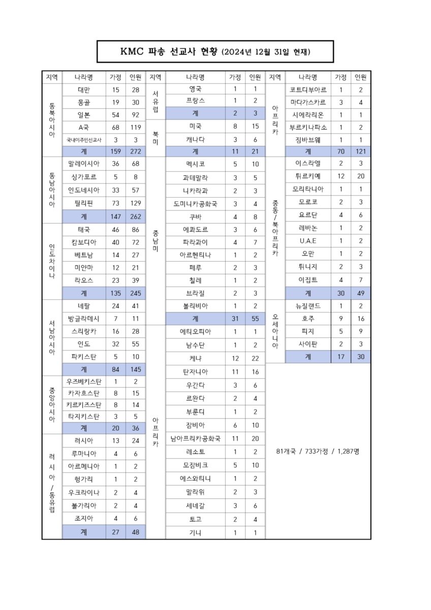 [세계선교사역부]2024년 선교사 현황표(12월 31일 기준)