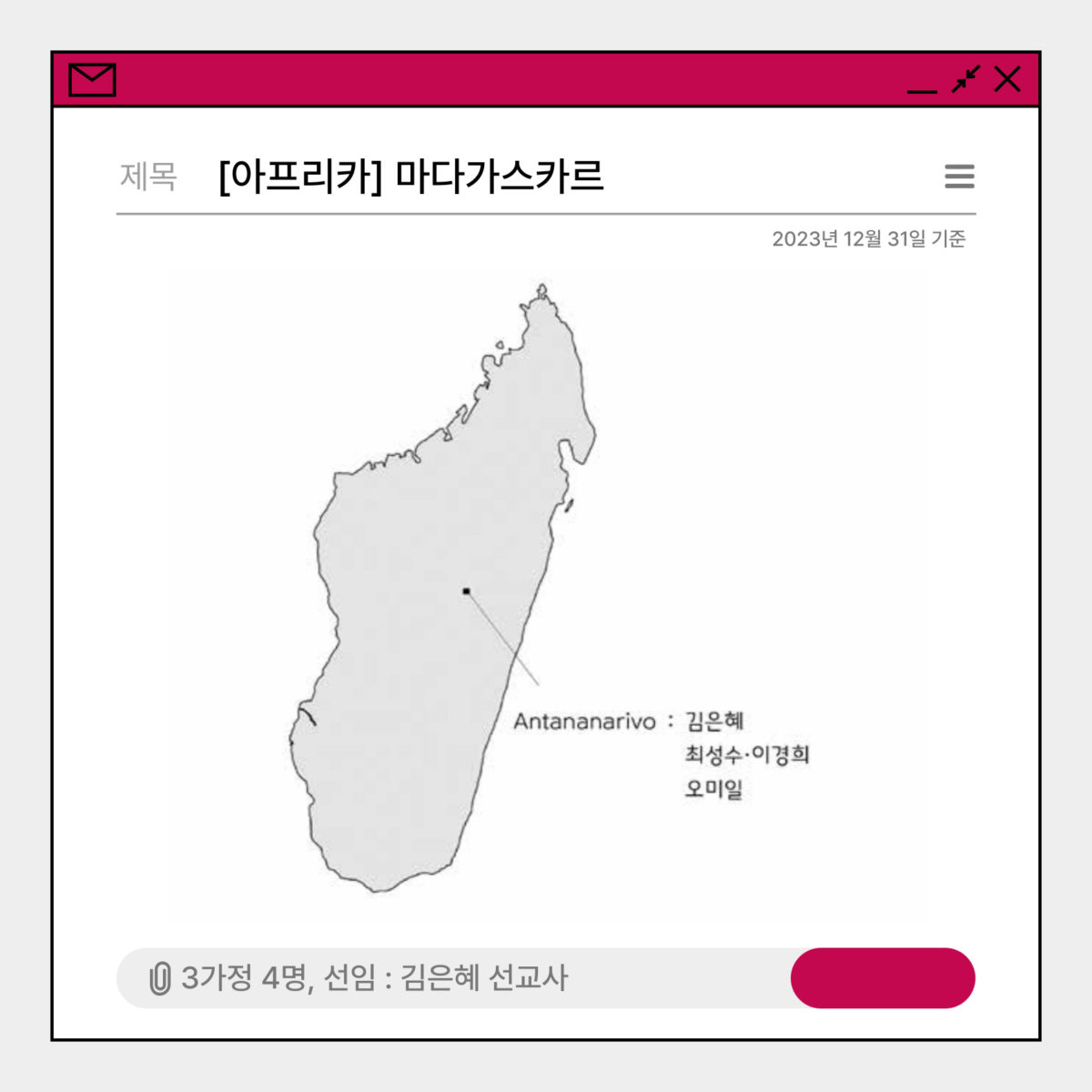 2) 2009년 감리교 장로 선교사 부부가 안치라베(Antsirabe) 지방에서 사립 중·고등학교를 설립해 교육 사역을 진행하다 현지 기독교 교단에 이양하고 2022년 철수하였다.