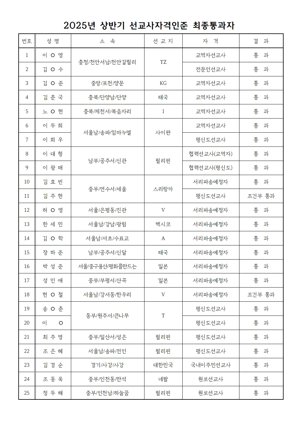 [선교] 2025 하반기 선교사자격인준심사 최종통과자 공지 및 파송절차 안내의 건