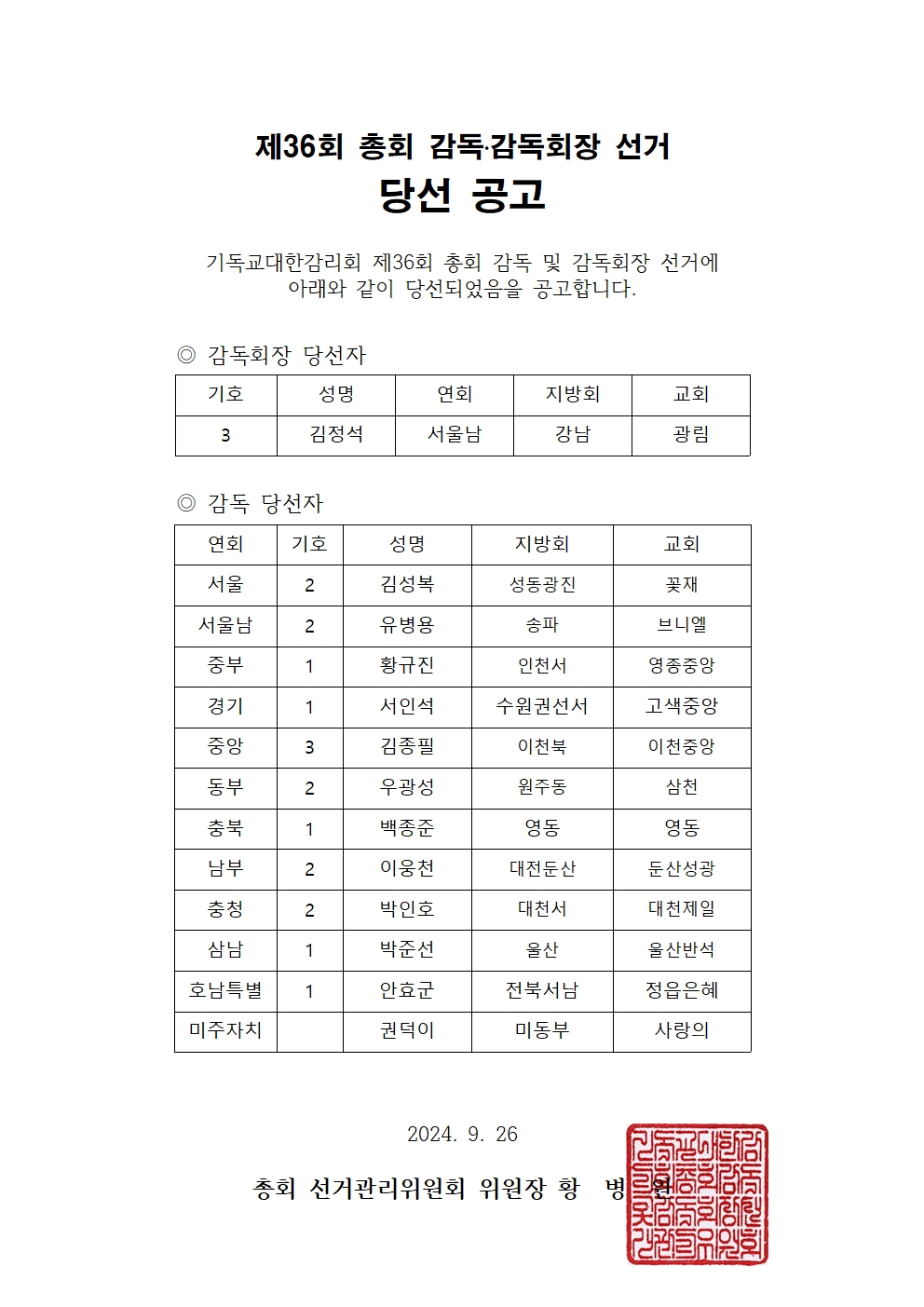 제36회 총회 감독‧감독회장 선거 당선자 공고