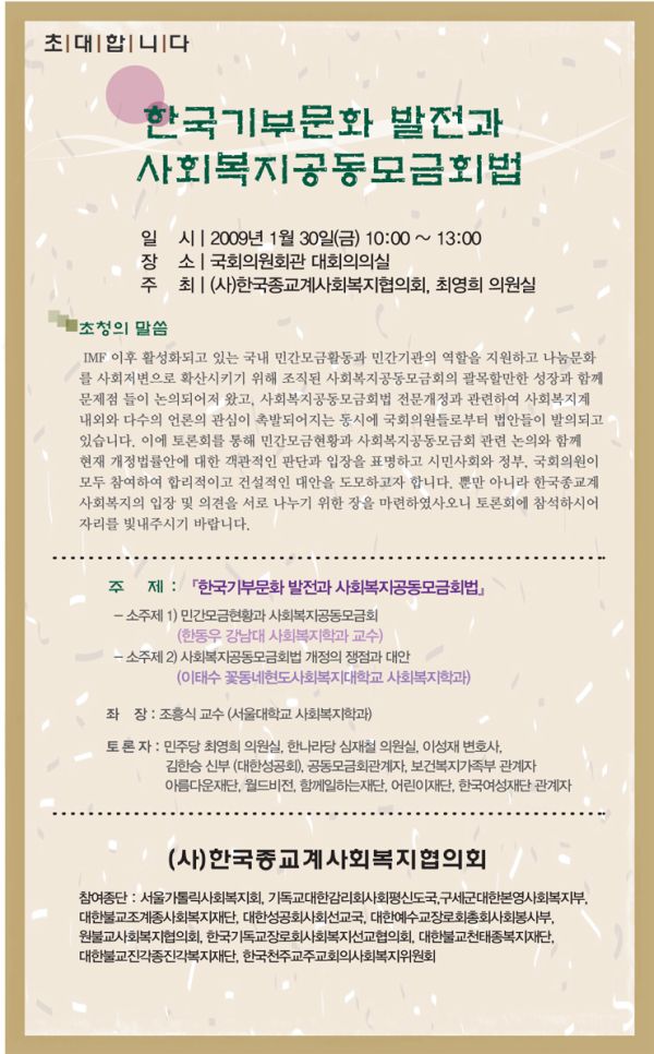 사회복지공동모금회법 토론회 일시: 2009년 1월30일(금) 10:00-13:00 장소: 국회의원회관 대회의실 주최: (사)한국종교계사회복지협의회, 최영희 의원실 주제: 한국기부문화의 발전과 사회복지공동 모금회법 첨부파일 29rswa.jpg 29rswa_sched.hwp