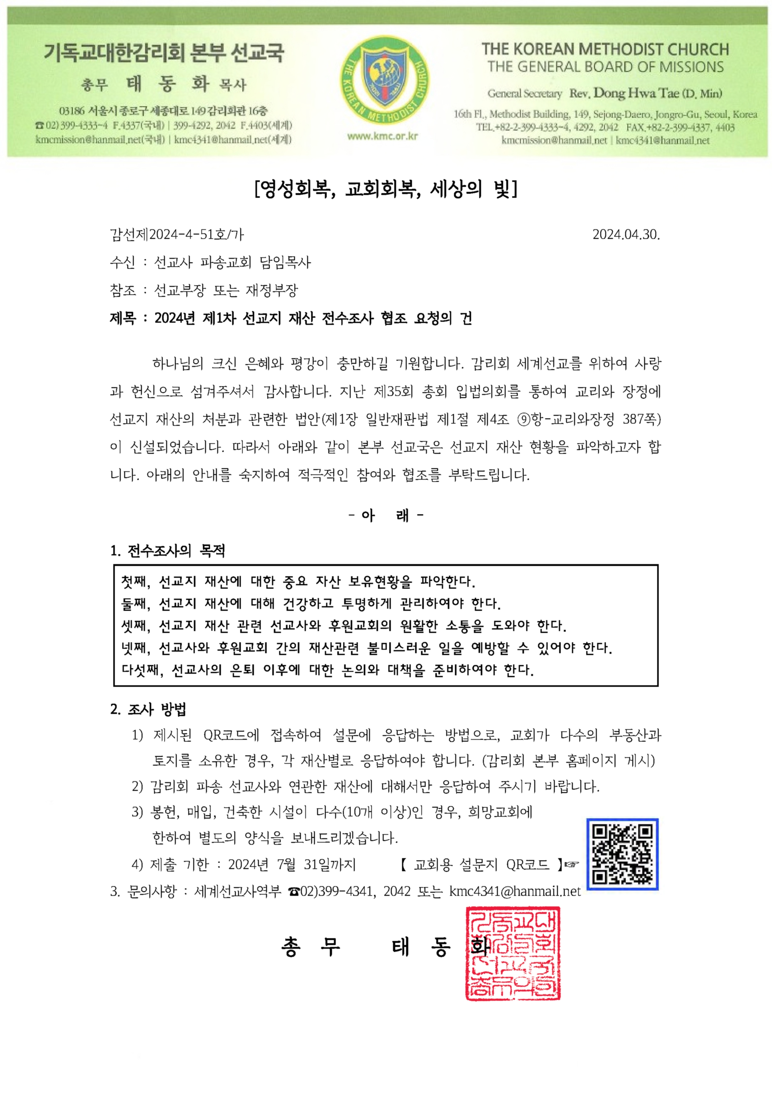 제목 : 2024년 제1차 선교지 재산 전수조사 협조 요청의 건
