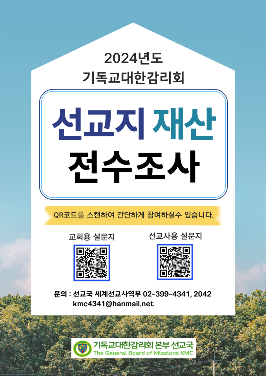 1) 제시된 QR코드에 접속하여 설문에 응답하는 방법으로, 선교사가 다수의 부동산과 토지를 소유한 경우, 각 재산별로 응답하여야 합니다. (감리회 본부 홈페이지 게시)