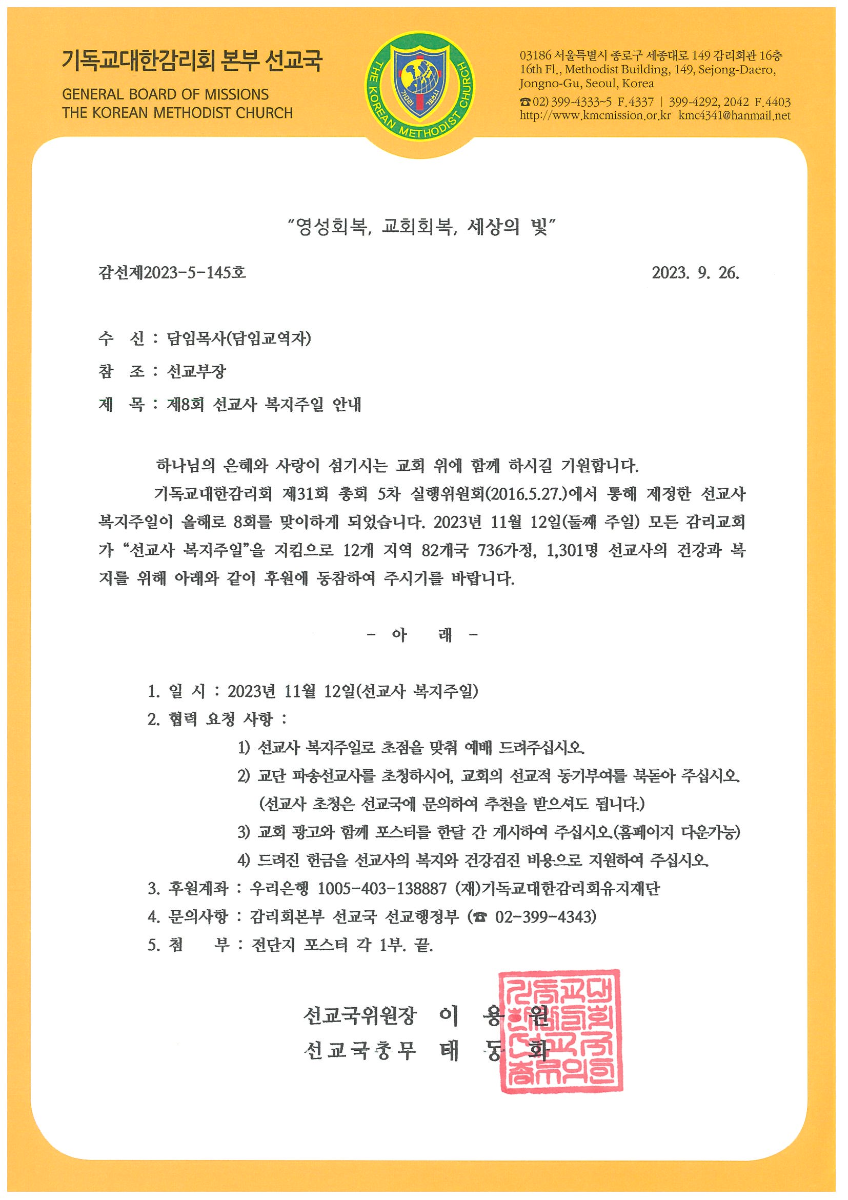 4. 문의사항 : 감리회본부 선교국 선교행정부 (☎ 02-399-4343)