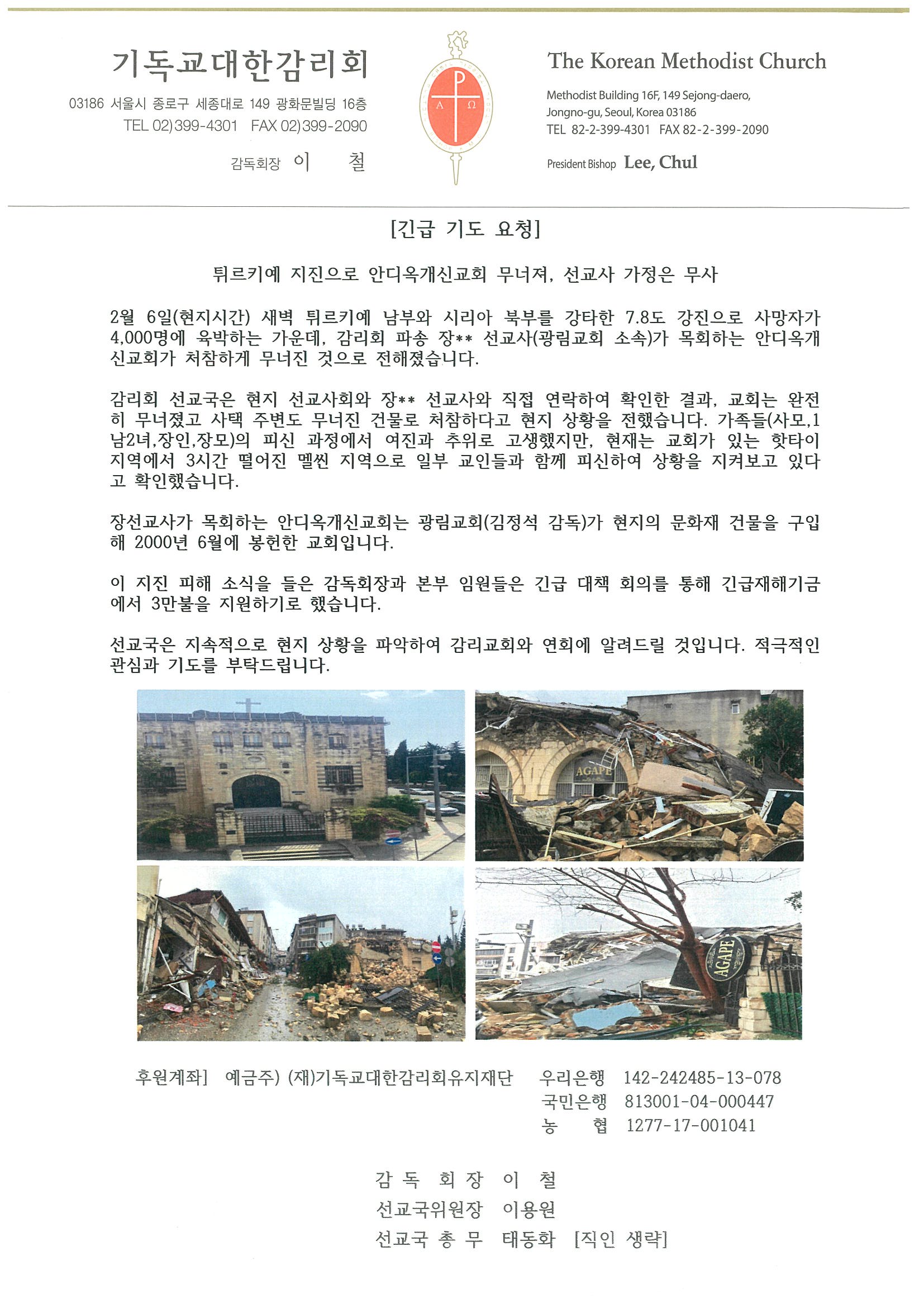 감리회 선교국은 현지 선교사회와 장** 선교사와 직접 연락하여 확인한 결과, 교회는 완전히 무너졌고 사택 주변도 무너진 건물로 처참하다고 현지 상황을 전했습니다. 가족들(사모,1남2녀,장인,장모)의 피신 과정에서 여진과 추위로 고생했지만, 현재는 교회가 있는 핫타이 지역에서 3시간 떨어진 멜씬 지역으로 일부 교인들과 함께 피신하여 상황을 지켜보고 있다고 확인했습니다.