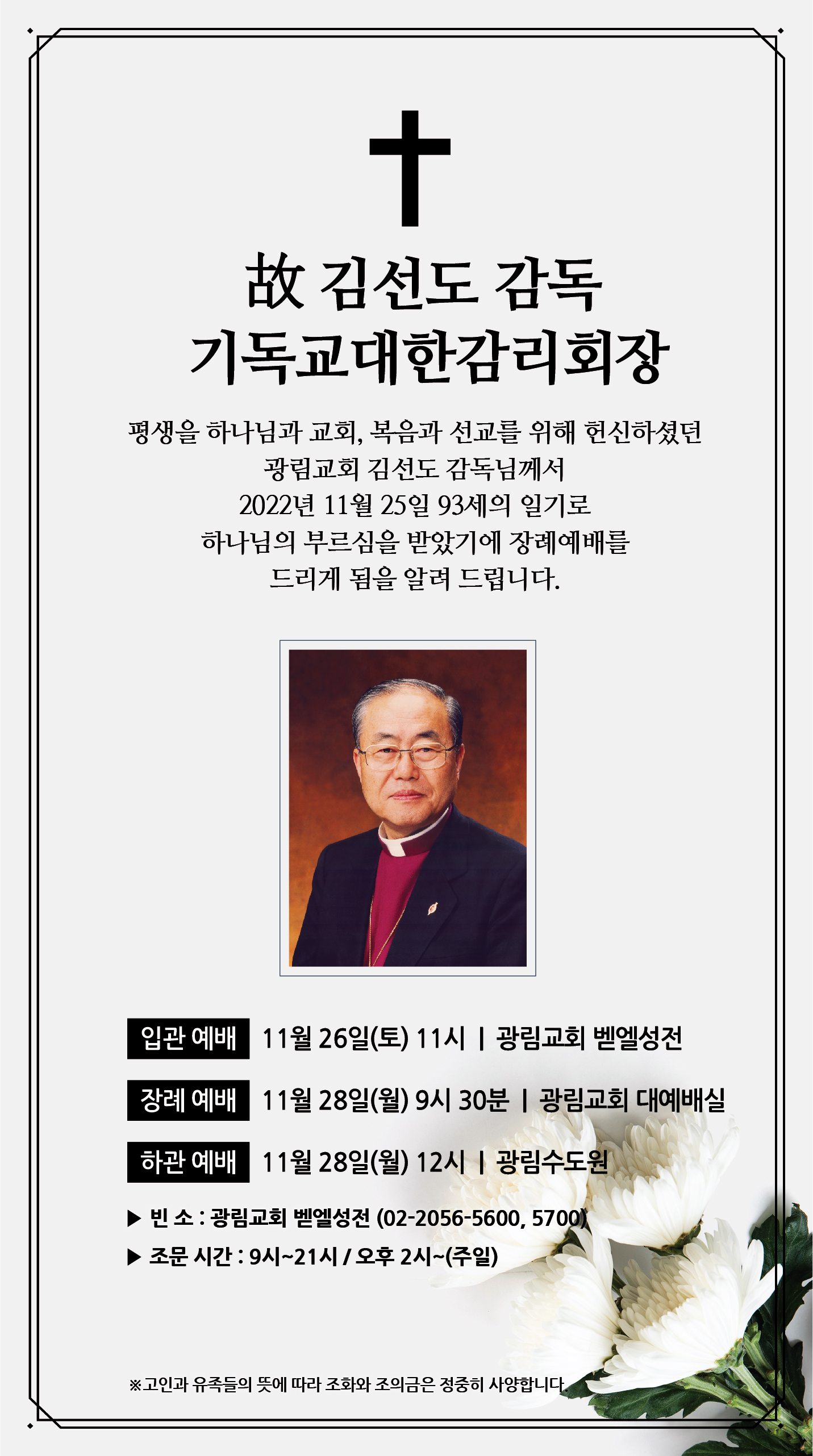 입관예배: 11월26일(토) 장례예배: 11월28일(월) 오전 9시30분(장소:광림교회 대예배실) ※ 장례조문: 11월25일 오후 2시 이후(장소:광림교회1층 벧엘성전) 첨부파일 638036d5d8cd74929362.jpg