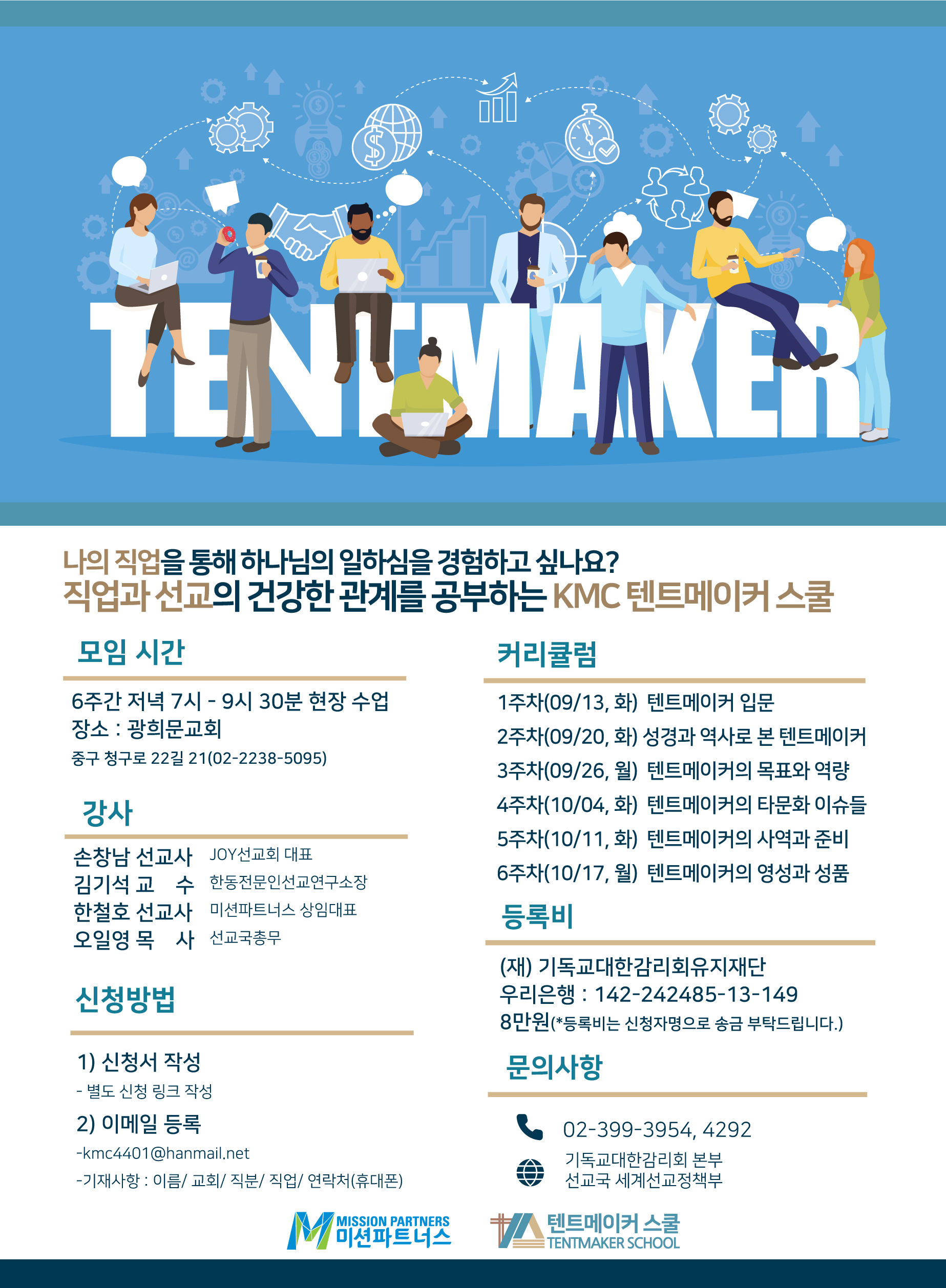 KMC 텐트메이커 스쿨 나의 직업을 통해 하나님의 일하심을 경험하고 싶나요? 직업과 선교의 건강한 관계를 공부하는 KMC 텐트메이커 스쿨이 시작됩니다. 1. 일시 : 2022년 9월 13일(화), 20일(화), 26일(월), 10월 4일(화), 11일(화), 17일(월) 오후 7시 ~ 오후 9시 30분 [ 총 6회 ] 2. 장소 : 광희문교회(중구 청구로22길 21, 02-2238-5095) 3. 커리큘럼 9/13 (화) 텐트메이커 입문 9/20 (화) 성경과 역사로 본 텐트메이커 9/26 (월) 텐트메이커의 목표와 역량 10/4 (화) 텐트메이커의 타문화 이슈들 10/11 (화) 텐트메이커의 사역과 준비 10/17 (월) 텐트메이커의 영성과 성품 및 수료식 4. 강사 손창남 선교사(OMF 동원책임) 한철호 선교사(미션파트너스 상임대표) 김기석 교수(한동전문인선교연구소장) 고제시 원장(바기오 영어마을 원장) 오일영 목사(선교국총무) 5. 강의 시간 6주간 오후 7시~ 9시 30분 현장 수업 6. 신청 방법 1) 신청서 작성 -> https://forms.gle/R5R67NTWLx8JTm1W7 (위 링크 클릭 후 신청서 작성) 2) 이메일 등록 기재 사항 : 이름/ 교회/ 직분/ 직업/ 연락처(휴대폰) 7. 등록비 : 8만원 8. 등록비 입금 계좌 우리B. 142-242485-13-149 (재)기독교대한감리회유지재단 * 등록비는 신청자명으로 송금부탁드립니다. 9. 문의사항 02-399-3954, 4292 기독교대한감리회 본부 선교국 세계선교정책부 |