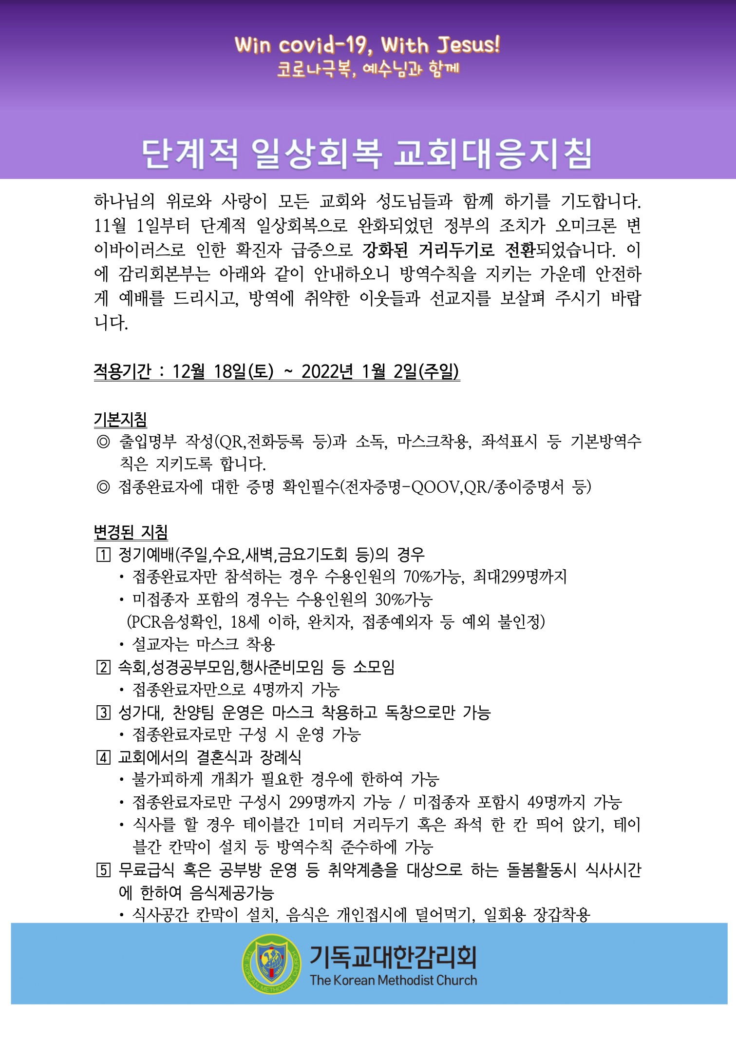 하나님의 위로와 사랑이 모든 교회와 성도님들과 함께 하기를 기도합니다. 11월 1일부터 단계적 일상회복으로 완화되었던 정부의 조치가 오미크론 변이바이러스로 인한 확진자 급증으로 강화된 거리두기로 전환되었습니다. 이에 감리회본부는 아래와 같이 안내하오니 방역수칙을 지키는 가운데 안전하게 예배를 드리시고, 방역에 취약한 이웃들과 선교지를 보살펴 주시기 바랍니다.
