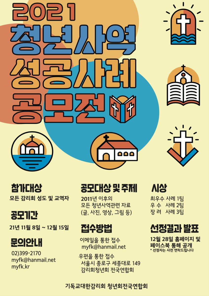 ‘단계적 일상회복’에 접어들며 많은 교회들이 ‘COVID-19’로 인해 침체된 청년 사역을 회복시키기 위하여 분투하는 이 시기에, ‘감리교 청년회 전국 연합회’에서는 ‘청년 사역 사례 공모전’을 개최하여 감리교 개교회의 청년 사역 사례 중 우수 사례를 모집하고 이에 시상하여 해당 사역 교회들의 노고에 감사함을 표하는 한편, 수집된 자료들을 책자로 만들어 배포하여 많은 교회들의 청년 사역에 작은 도움을 주고자 합니다.