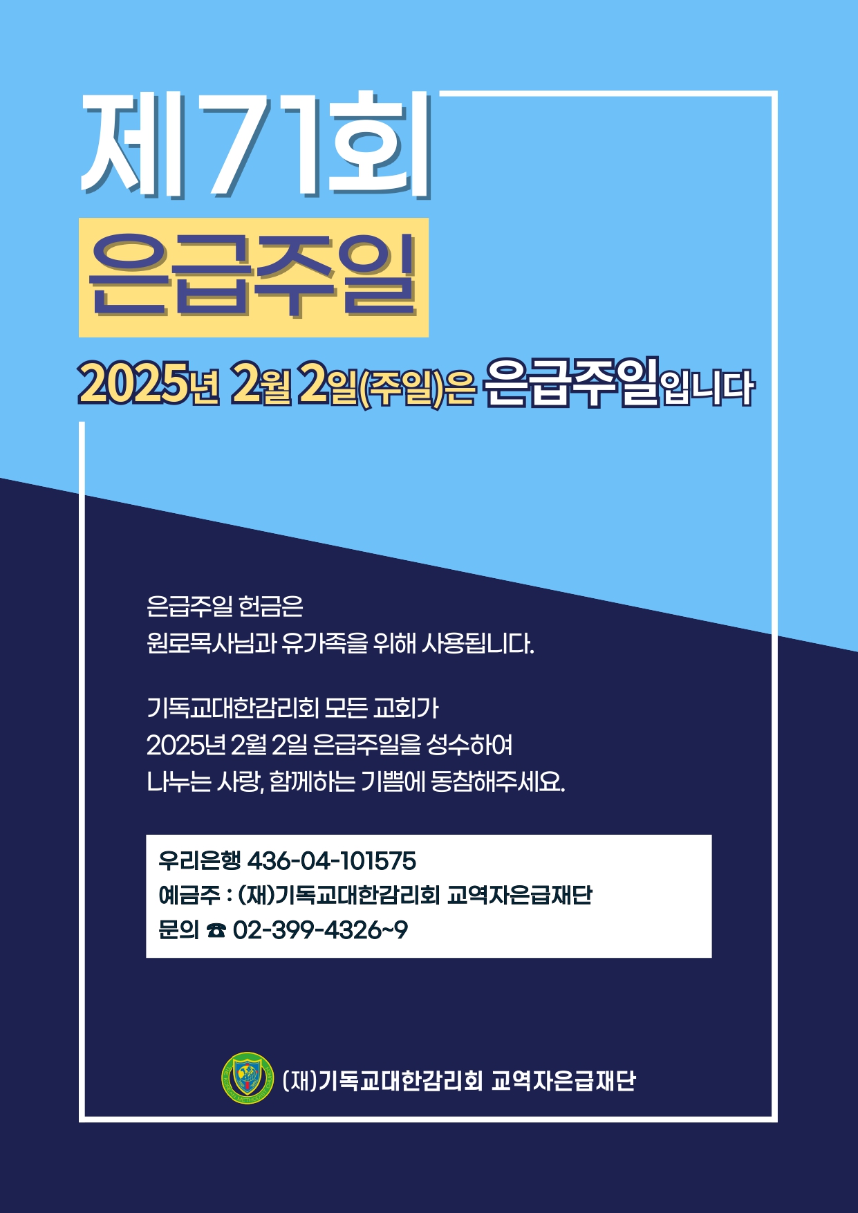 2. 2025년 2월 2일(주일), 제71회 은급주일을 맞이합니다. 은급주일 헌금은 원로목사님과 유가족을 위해 사용됩니다. 기독교대한감리회 모든 교회가 은급주일을 성수하여 나누는 사랑, 함께하는 기쁨에 동참해주세요.