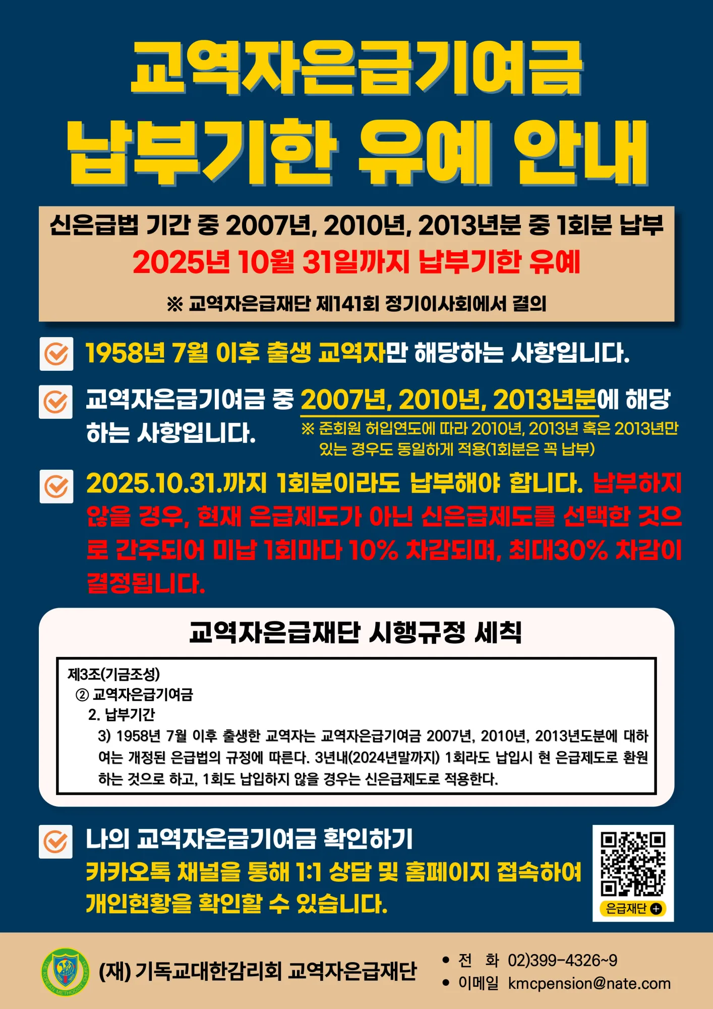 1. 신은급법 기간 중 교역자은급기여금 2007년, 2010년, 2013년분에 대한 1회분 납부기한이 2024년 12월 31일까지였으나, 2025년 10월 31일까지로 유예되었습니다. (※교역자은급재단 제141회 정기이사회에서 결의)