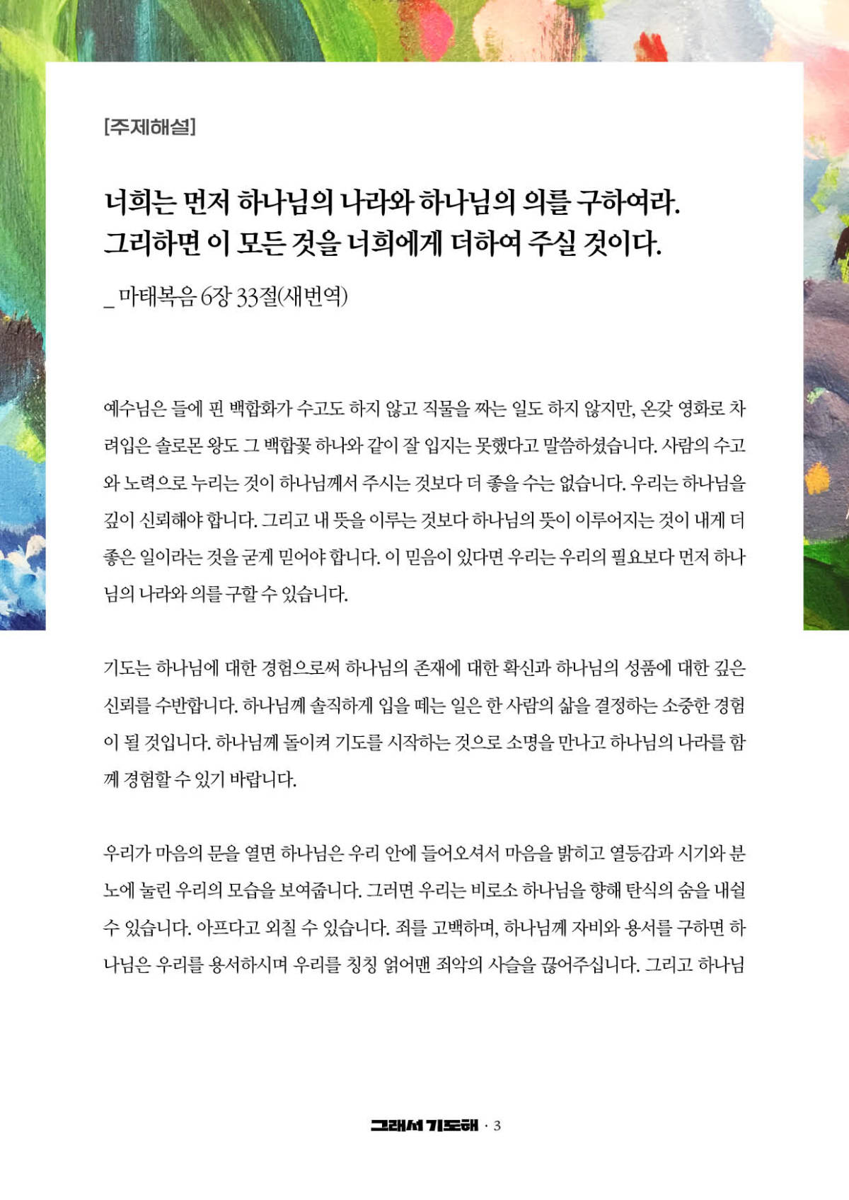 * 주제성구 : 마태복음 6장 33절 (새번역)