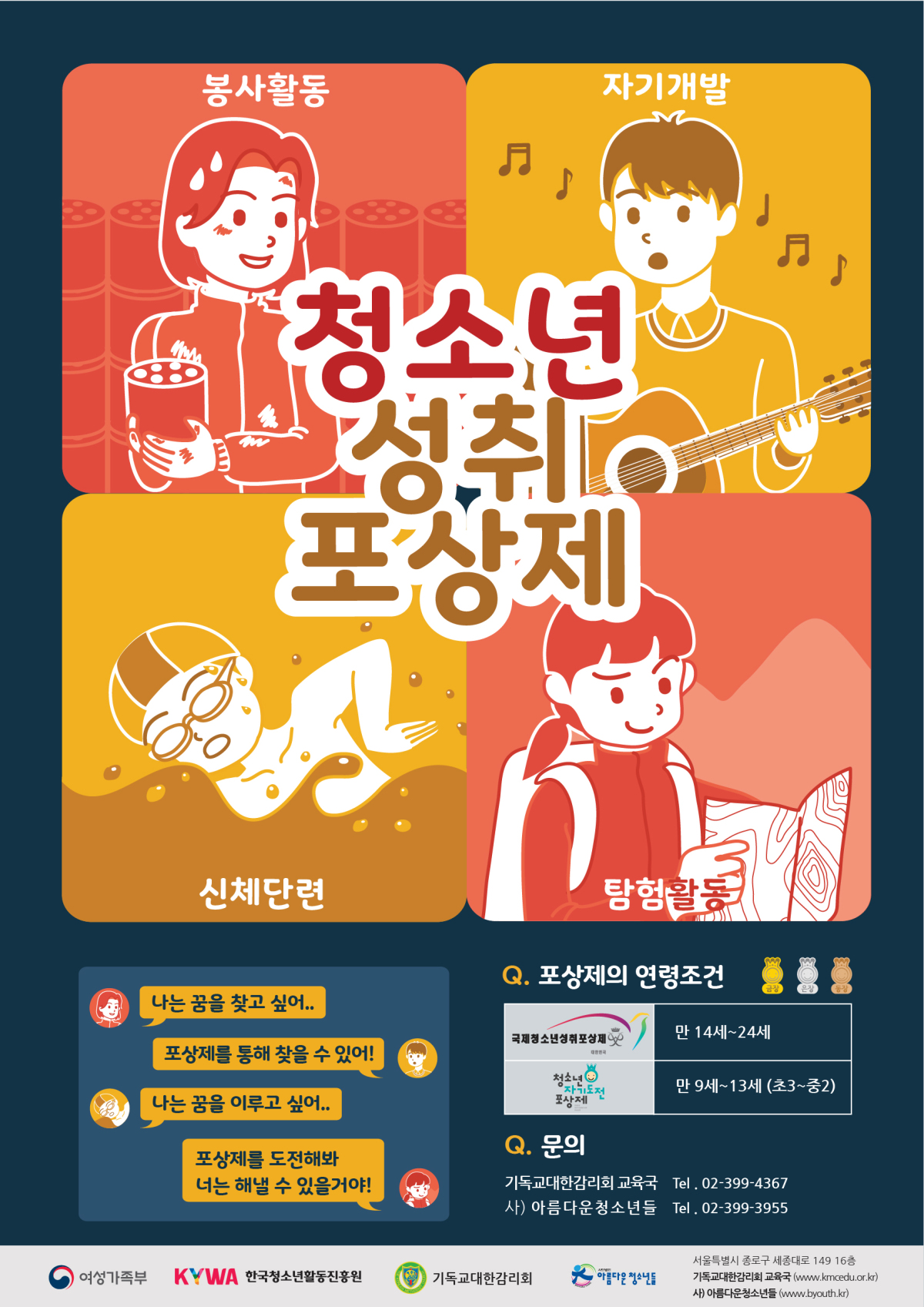 - 만 20세 이상의 청소년 관련 경력이 3년 이상인 자 (교회학교 교사 경력 포함)