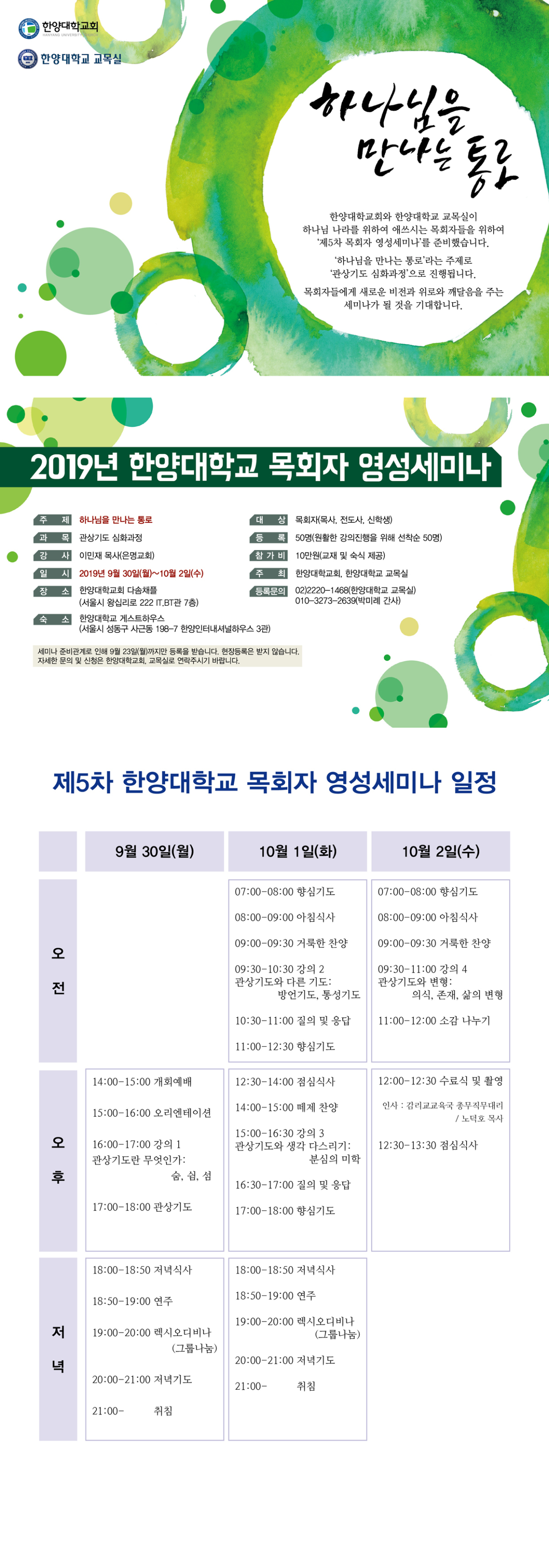한국교회는 위기를 맞이하고 있습니다. 한국교회는 하나님 나라의 확장이 아닌, 교회의 확장을 위해 전념하였지만, 교회는 축소되고 있고, 사회로부터 존경과 신뢰를 상실하고 있습니다. 우리 목회자들에게 중요한 것은 사람들을 교회로 끌어 모으는 기술이 아니라, 하나님을 만나고, 하나님의 소리를 듣고, 하나님의 말씀을 따르는 영성입니다. 70년대 이전에 한국교회 교인들은 부흥회를 통하여 하나님을 만나는 경험을 했습니다. 이제 그 세대가 지나가고 있습니다. 하나님을 만나는 통로로 부흥회를 대체할 수 있는 대안이 필요합니다. 전통적으로 그리스도인들이 하나님을 만나는 통로는 성서일과(Lectionary)에 따른 말씀, 거룩한 독서(Lectio Divina), 관상기도Contemplative Prayer), 찬송(Hymn), 성만찬(Holy Communion) 등이었습니다. 다시 전통으로 돌아가는 것이 대안입니다. 전통으로 돌아가 뿌리를 깊게 내릴 때입니다. 이러한 취지에서 한양대학교회와 한양대학교 교목실은 기독교대한감리회 교육국과 함께 네 차례의 <목회자 영성세미나>를 통하여 한국교회에 기여했습니다. 2019년에는 참가자들의 요청으로 심화과정을 준비했습니다. 관상기도를 통하여 하나님의 소리를 듣고, 하나님을 만나는 경험을 하려고 합니다. 한양대학교는 ‘사랑의 실천’을 건학 이념으로 1939년에 세워진 대학교이고, 대학교회와 교목실을 통하여 하나님 나라 확장에 힘쓰고 있습니다.