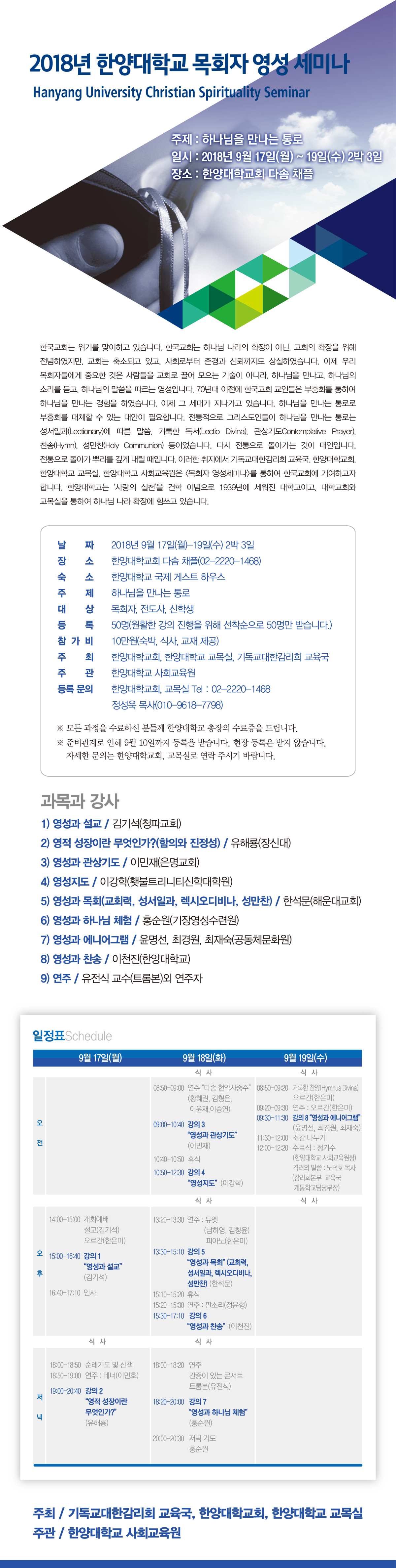 감리회본부 교육국은 한양대학교 교목실, 한양대학교 사회교육원과 협력하여 <목회자 영성세미나>를 통하여 한국교회에 기여하고자 합니다. 한국교회는 위기를 맞이하고 있습니다. 한국교회는 하나님 나라의 확장이 아닌, 교회의 확장을 위해 전념하였지만, 교회는 축소되고 있고, 사회로부터 존경과 신뢰까지도 상실하였습니다. 이제 우리 목회자들에게 중요한 것은 사람들을 교회로 끌어 모으는 기술이 아니라, 하나님을 만나고, 하나님의 소리를 듣고, 하나님의 말씀을 따르는 영성입니다. 70년대 이전에 한국교회 교인들은 부흥회를 통하여 하나님을 만나는 경험을 하였습니다. 이제 그 세대가 지나가고 있습니다. 하나님을 만나는 통로로 부흥회를 대체할 수 있는 대안이 필요합니다. 전통적으로 그리스도인들이 하나님을 만나는 통로는 성서일과(Lectionary)에 따른 말씀, 거룩한 독서(Lectio Divina), 관상기도Contemplative Prayer), 찬송(Hymn), 성만찬(Holy Communion) 등이었습니다. 다시 전통으로 돌아가는 것이 대안입니다. 전통으로 돌아가 뿌리를 깊게 내릴 때입니다. 한양대학교는 ‘사랑의 실천’을 건학 이념으로 1939년에 세워진 대학교이고, 대학교회와 교목실을 통하여 하나님 나라 확장에 힘쓰고 있습니다.