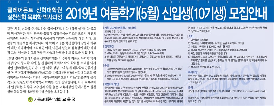 클레아몬트 목회학박사과정 2019년 여름학기(5월) 신입생(10기) 모집 안내