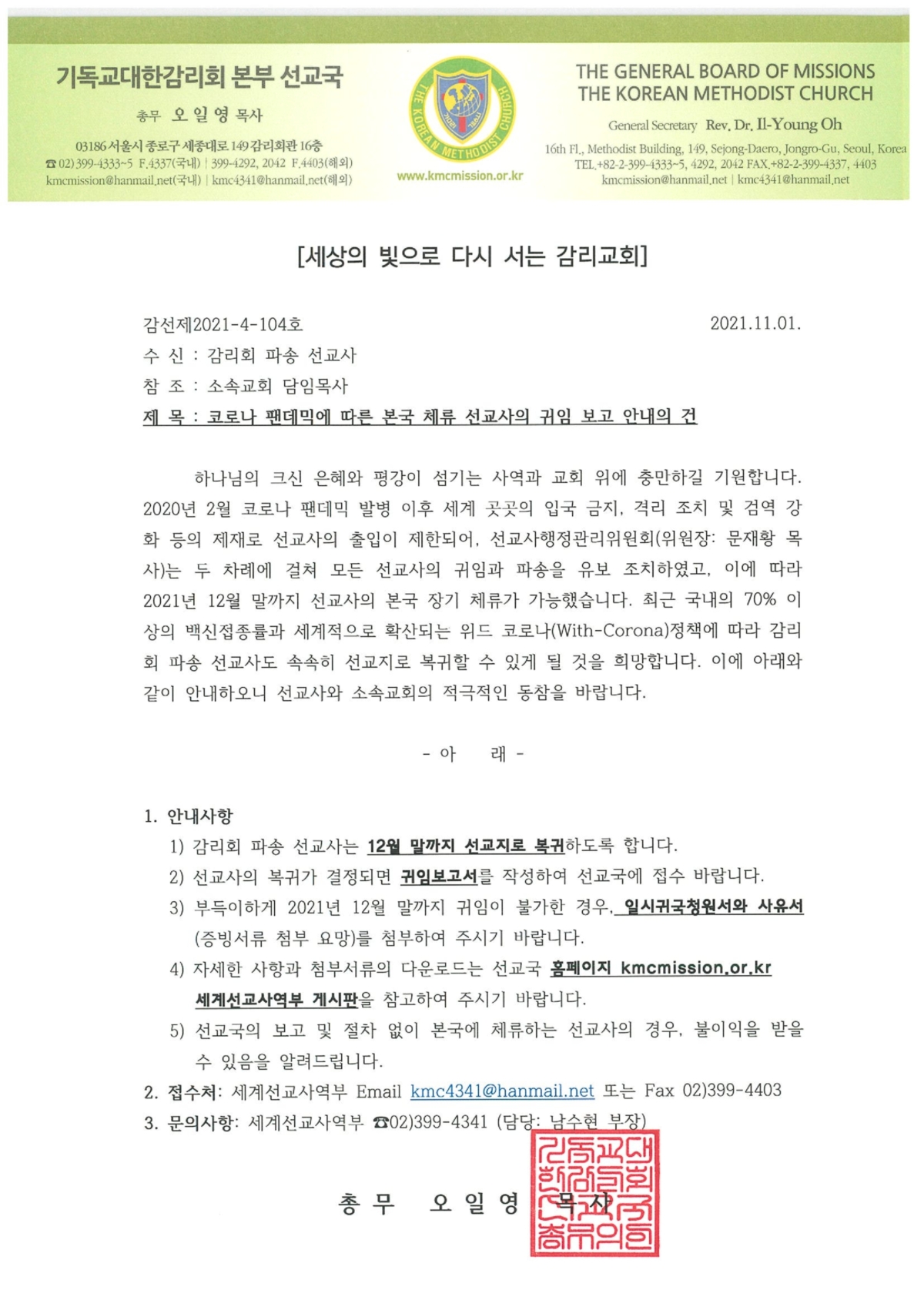 첨부파일 감선제2021-4-104호.jpg 귀임보고서(안식년.병가.일시귀국후).docx 귀임보고서(안식년.병가.일시귀국후).hwp 소속교회 귀국동의서(2021).hwp 소속교회 귀국동의서.docx 일시 귀국 청원서(2021).hwp 일시 귀국 청원서.docx