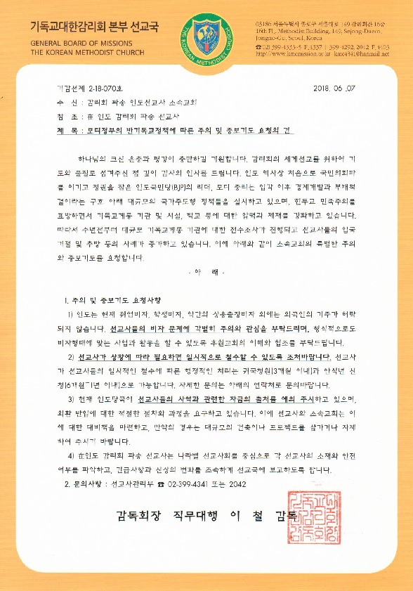 [인도]모디정부의 반기독교정책에 따른 주의 및 중보기도 요청의 건