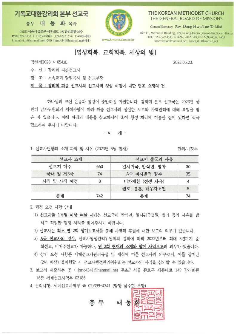하나님의 크신 은총과 평강이 충만하길 기원합니다. 감리회 본부 선교국은 2023년 상반기 감사위원회의 지적사항에 따라 파송 선교사의 성실한 보고와 사역관리에 대해 요청을 받은 바 있습니다. 이에 아래의 내용을 참고하시어 혹여 행정 처리에 미흡한 점이 있다면 적극 협조하여 주시기 바랍니다.