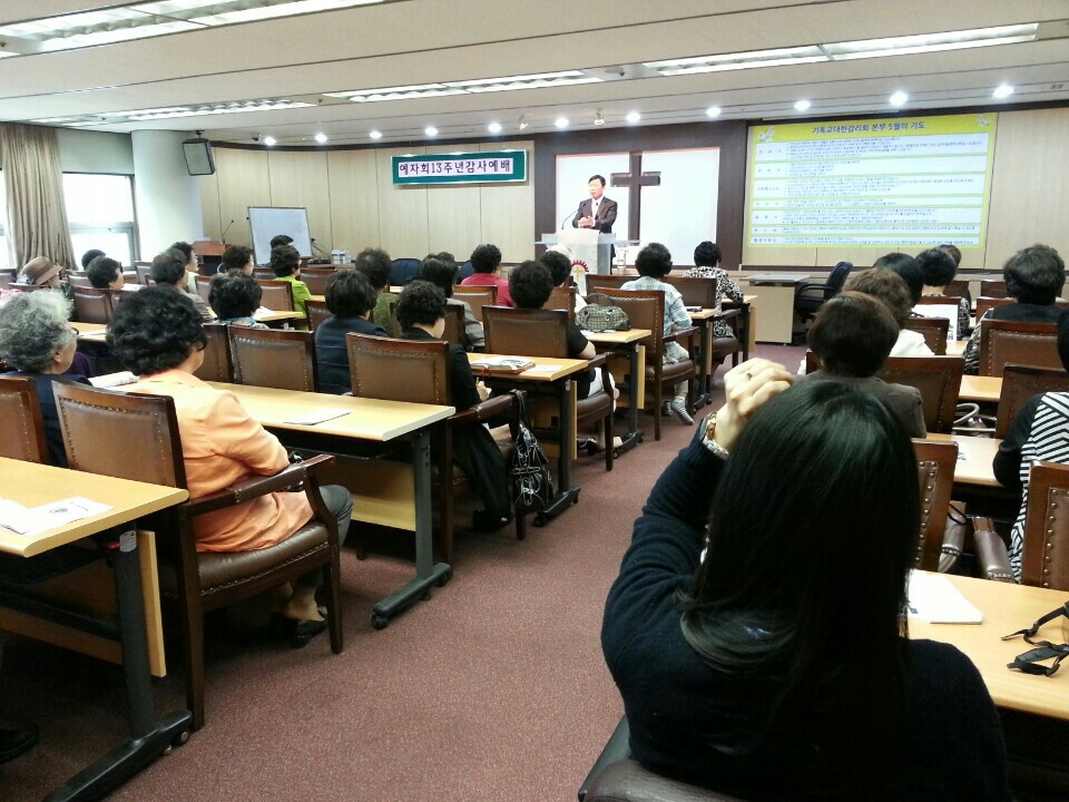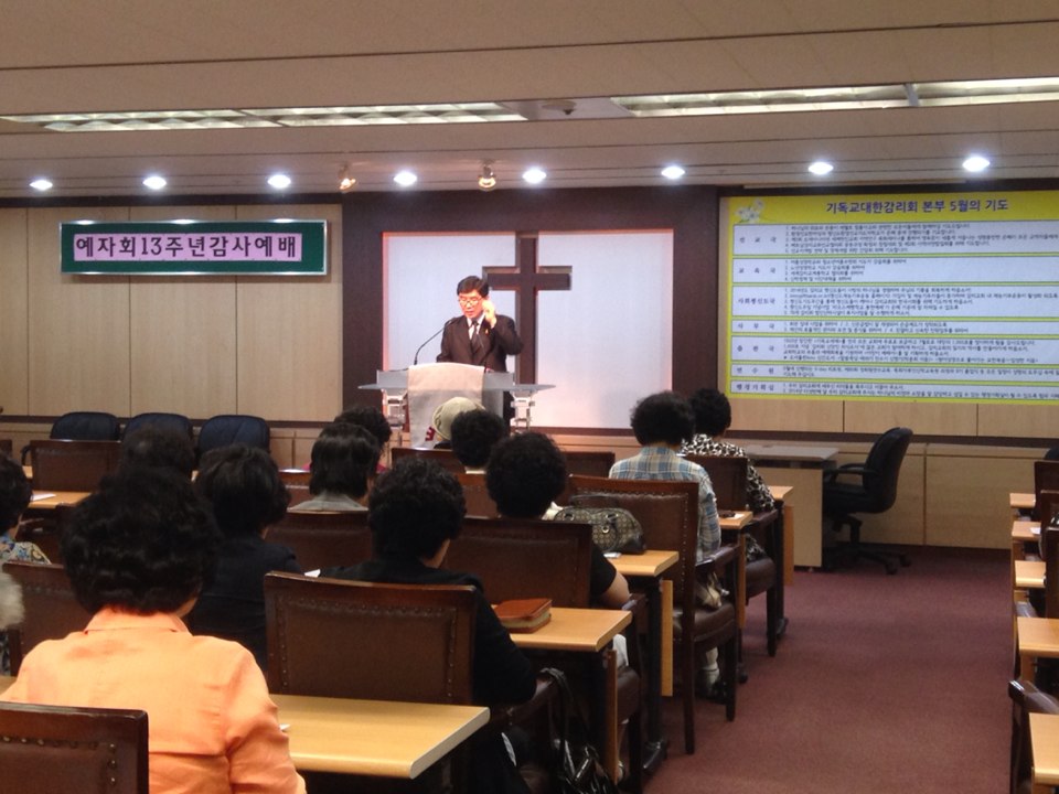 5월 19일(월) 오후 1시 30분. 본부교회에서 감리교회 홀사모님들의 모임인 예수자랑사모선교회의 창립 13주년기념 감사예배가 드려졌습니다. 약 50명의 사모님들과 서울연회 열림교회가 함께하였습니다. 담임 이인선목사님은 말씀을 통해 큰 위로와 은혜를 전해 주었습니다. 또한 예배 전에 종로1가의 더부페에서 좋은 식사를 제공하시고 예쁜 부채를 선물로 주시었습니다. 예자회 회장 이정정사모는 인사말씀을 통해 지난 날을 회고하며 그간 도움을 주신 모든 교회와 열림교회에 감사를 표했습니다.