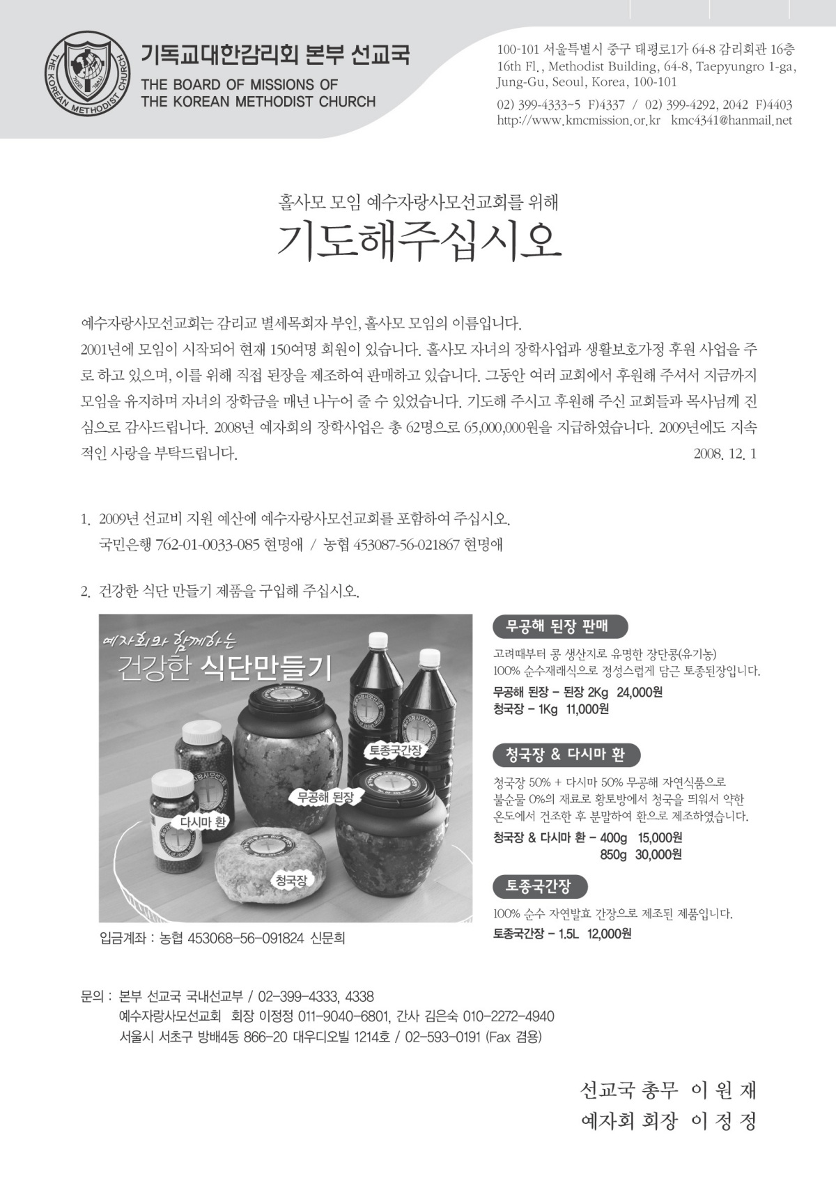 2008년 홀사모 모임(예수자랑사모선교회) 지원요청