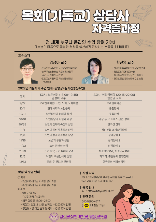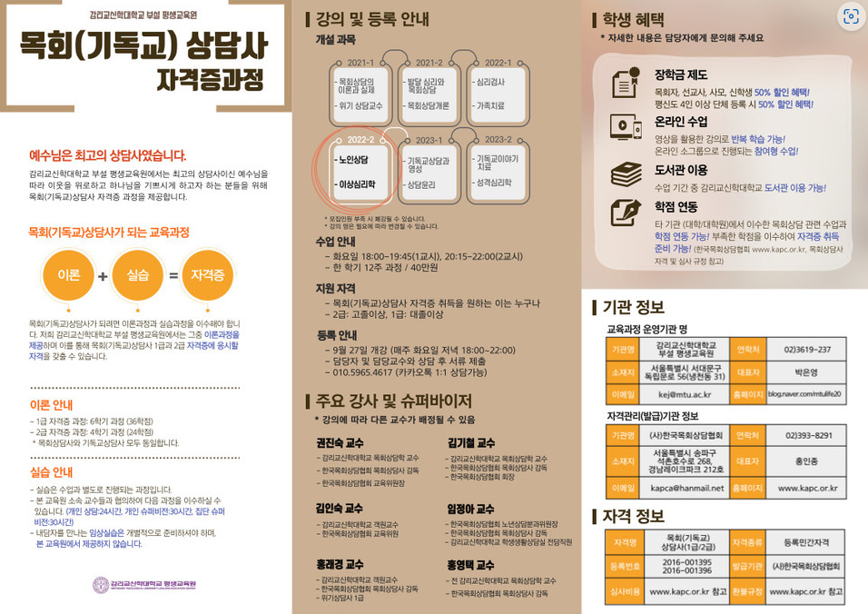 2022년 9월 27일(화) 감리교신학대학교 평생교육원(박은영 원장)에서 목회(기독교)상담사 자격증 과정이 개강합니다. 위 평생교육원에서는 한국 목회상담협회가 발급하는 1급, 2급 자격증 이수를 위한 이론 수업을 제공합니다.