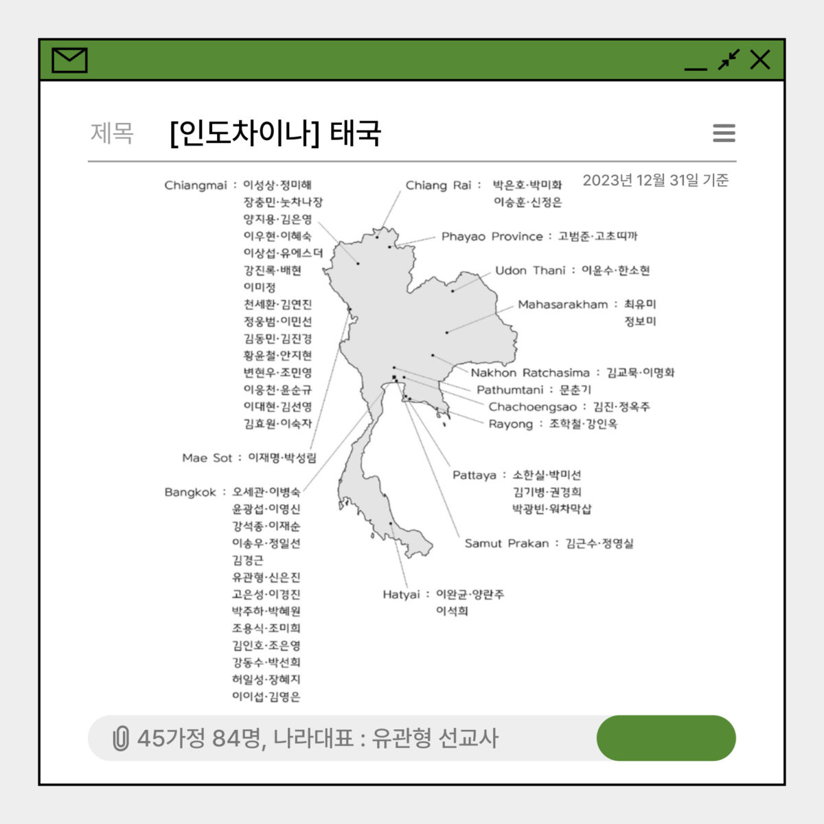 7) 태국의 동북부 지역은 라오스, 캄보디아와 접해 있으며 아세안-중국 대륙간 고속철도 건설이 계획되어 있습니다. 발전 가능성이 높은 이 지역에 다양한 교육 사역을 통하여 지역 사회에 공헌하는 선교적 교회들이 더욱 많아지게 하소서.