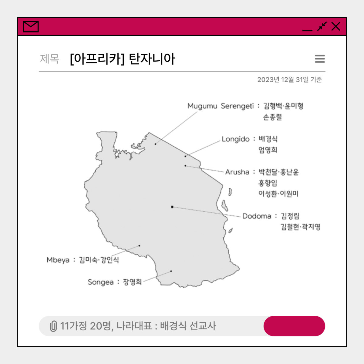 한국 감리교회 선교사들은 협력하는 각 현지교단과 단체에 소속되어 하나님께서 부르신 소명에 따라 탄자니아에서 하나님의 선교 사역에 힘쓰고 있다.