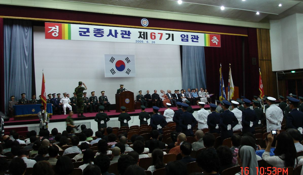 2009년 6월 26일(금) 14:00 경북 영천 제3사관학교에서 군종사관 임관식이 있었다. 60명의 군종장교가 임관하였으며 이중 군목이 27명이었고 감리교는 6명이었다(육군 5명, 공군 1명). 이들은 목사안수를 받은 후 3년이 되어 대위로 임관하였으며 황인태군목은 훈련성적 전체 1등으로 국방부장관상을 받았다. 군선교회 이사장 정의선목사는 금일봉을 전달하며 격려하였고, 회장 박종규목사도 격려금을 전달하였다. 군선교회 백창현총무와 국내선교부장도 함께 하였다. 사진 뒤 왼쪽에서부터 신임군목의 부친인 원기배목사, 김준형목사이다. 이외에도 많은 가족들이 임관식에 참석하여 축하하였다.