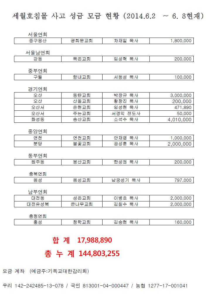 세월호 침몰사고돕기 성금 현황6(~6.8)