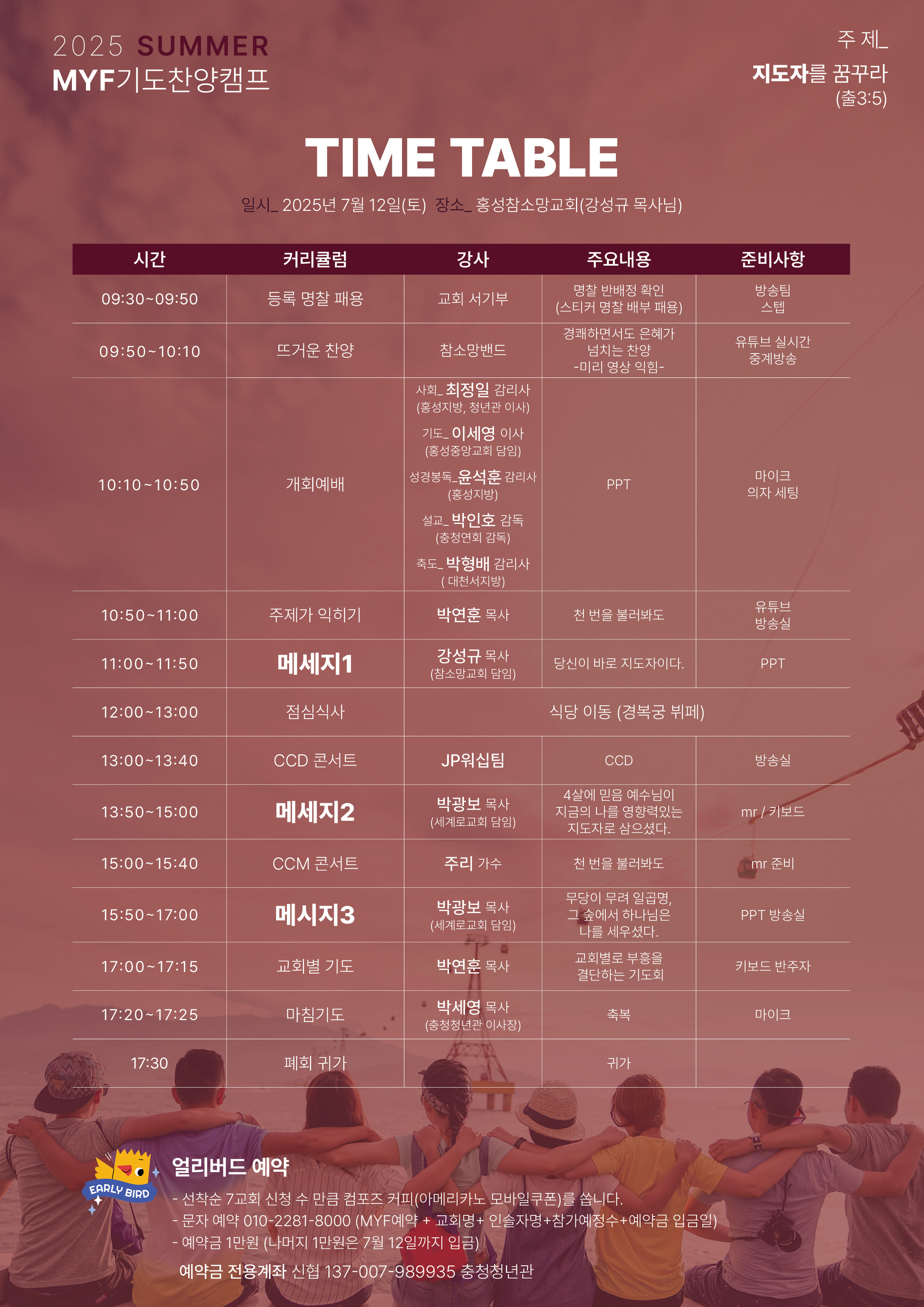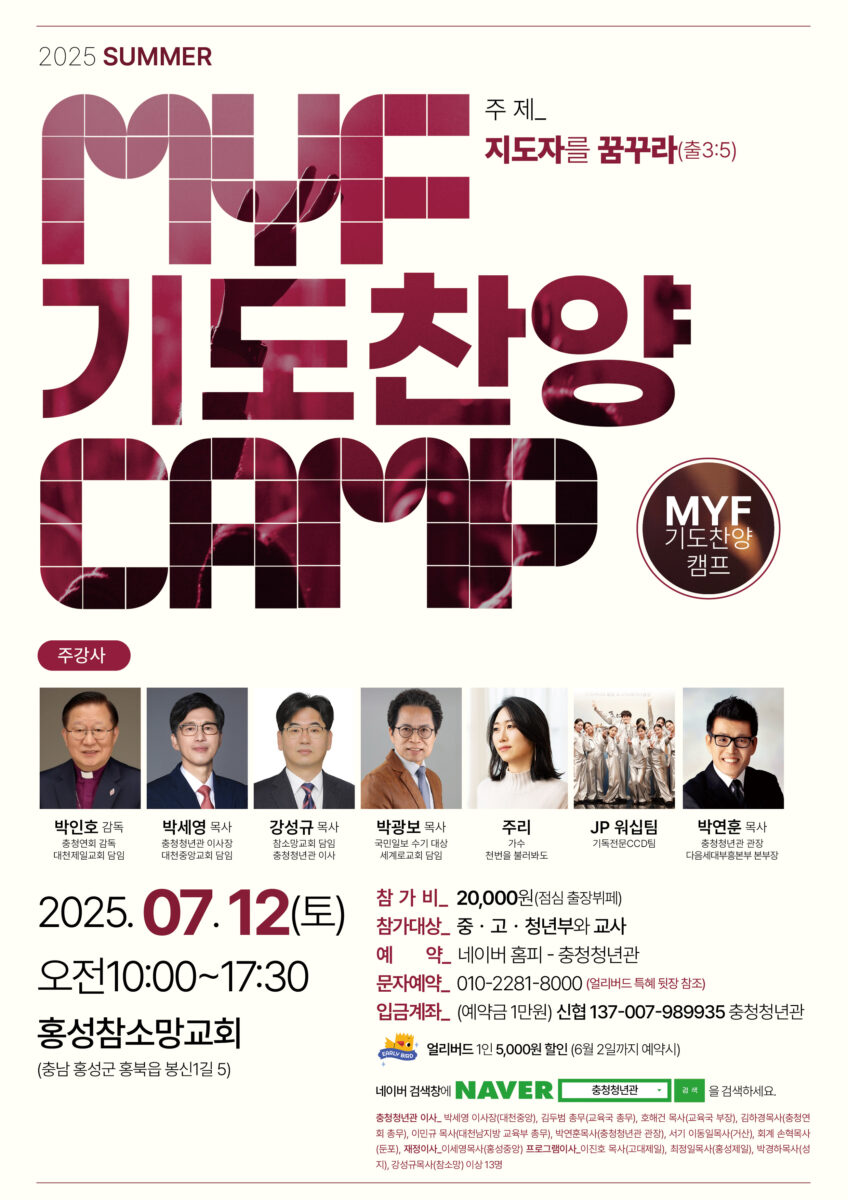 충청청년관에서 개최하는 중고청 전문캠프에 초대합니다. -2025년 7월 12일(토) 오전9:30~오후 5:30 -장소 홍성참소망교회(강성규목사 시무) -주강사 : 강성규목사, 박광보목사, 주리, JP워십팀 -문자예약 010-2281-8000 (연회명 + 지방명 + 교회명 + 담당자명 + 참가 예정수) 첨부파일 myf-포스터.jpg myf시간표.jpg
